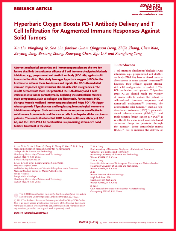 Hyperbaric Oxygen Boosts PD‐1 Antibody Delivery and T Cell Infiltration for Augmented Immune Responses Against Solid Tumors
